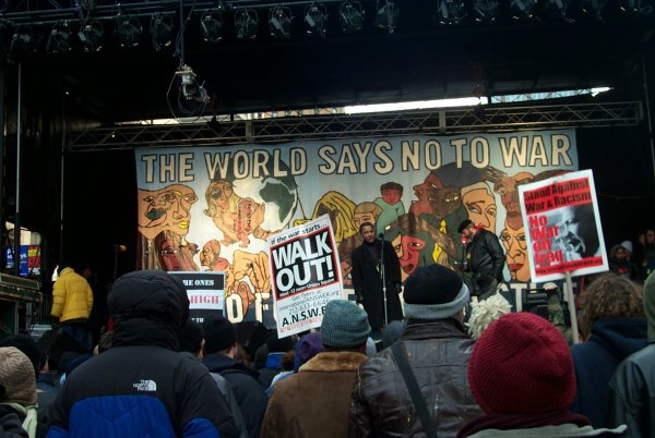 The biggest irony of the day was how the United States of America, the self-appointed worldwide defender of democracy viciously blocked its citizens from peaceably assembling, while nearly every other country in the world (Iraq included) allowed their citizens to march freely, in opposition to one of humankind's worst horrors.