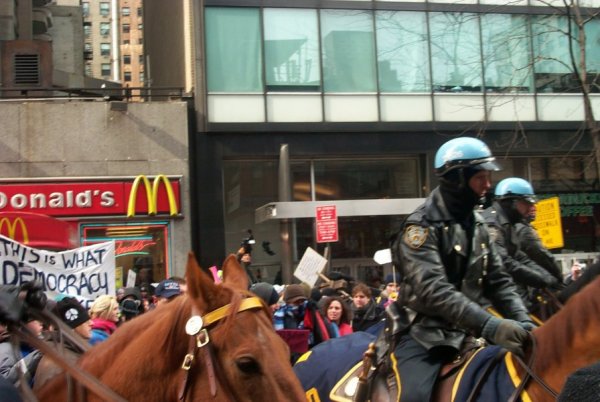 The horses from the sidewalk joined a brigade of about ten more horses out on 2nd Avenue, and then started charging, quickly and violently through the dense crowd, toward the blockade, wedging us in two. We were all appalled and began yelling at the police. After we reassembled, the mounted police charged through us again with the same intensity as before. It was incredible, and I thought that some people must have been injured. We were all deeply disturbed and continued scolding the mounted police, albeit from a safe distance.
